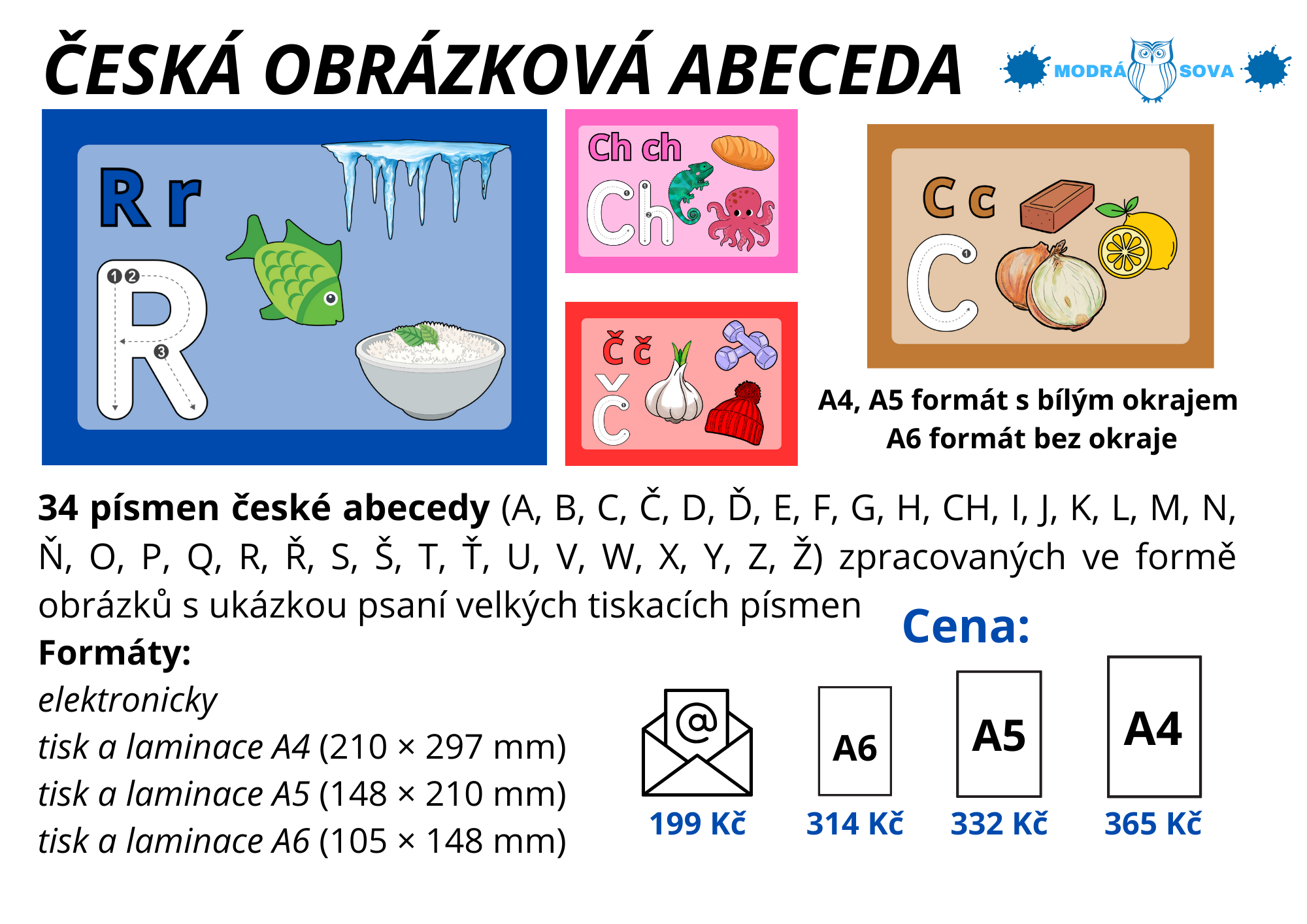 Tato unikátní obrázková abeceda obsahuje 34 písmen české abecedy, včetně diakritických variant s háčkem, od A po Ž. Každé písmeno je doplněno obrázky, které dětem usnadní zapamatování a podporují vizuální asociace. Ukázka psaní velkého tiskacího písmene pomáhá rozvíjet jejich grafomotoriku. Díky barevné pestrosti se hodí jako výzdoba do každé třídy nebo dětského pokoje.