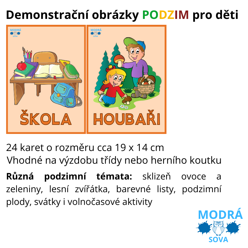 - Podzimní demonstrační obrázky pro děti – 24 barevných karet (14×19 cm)