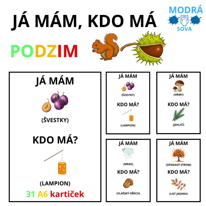 Hra obsahuje 31 A6 kartiček. Na každé kartičce jsou dva obrázky z tématu PODZIM, přičemž dítě vždy řekne "Já mám" a pojmenuje první obrázek (např. Já mám hrušku), zatím co se táže svých spolužáků "Kdo má" a řekne název druhého obrázku (např. Kdo má veverku). Teď je na řadě další dítě, aby postup zopakovalo se svou dvojicí obrázků.