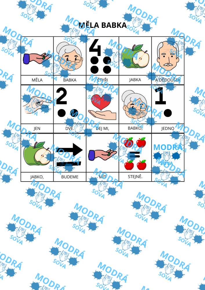 Písnička Měla babka čtyři jabka je vhodným výukovým materiálem pro všechny malé zpěváky. Díky hravým piktogramům nenásilně pomáhá rozvíjet porozumění u všech dětí a je vhodná i pro děti s narušenou komunikační schopností (např. pro děti s PAS, vývojovou dysfázií apod.).