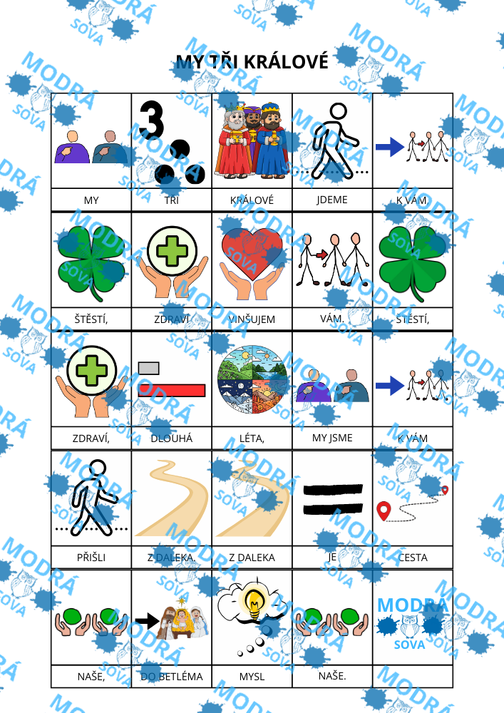 Koleda My tři králové je vhodným výukovým materiálem pro všechny malé zpěváky. Díky hravým piktogramům nenásilně pomáhá rozvíjet porozumění u všech dětí a je vhodná i pro děti s narušenou komunikační schopností (např. pro děti s PAS, vývojovou dysfázií apod.).