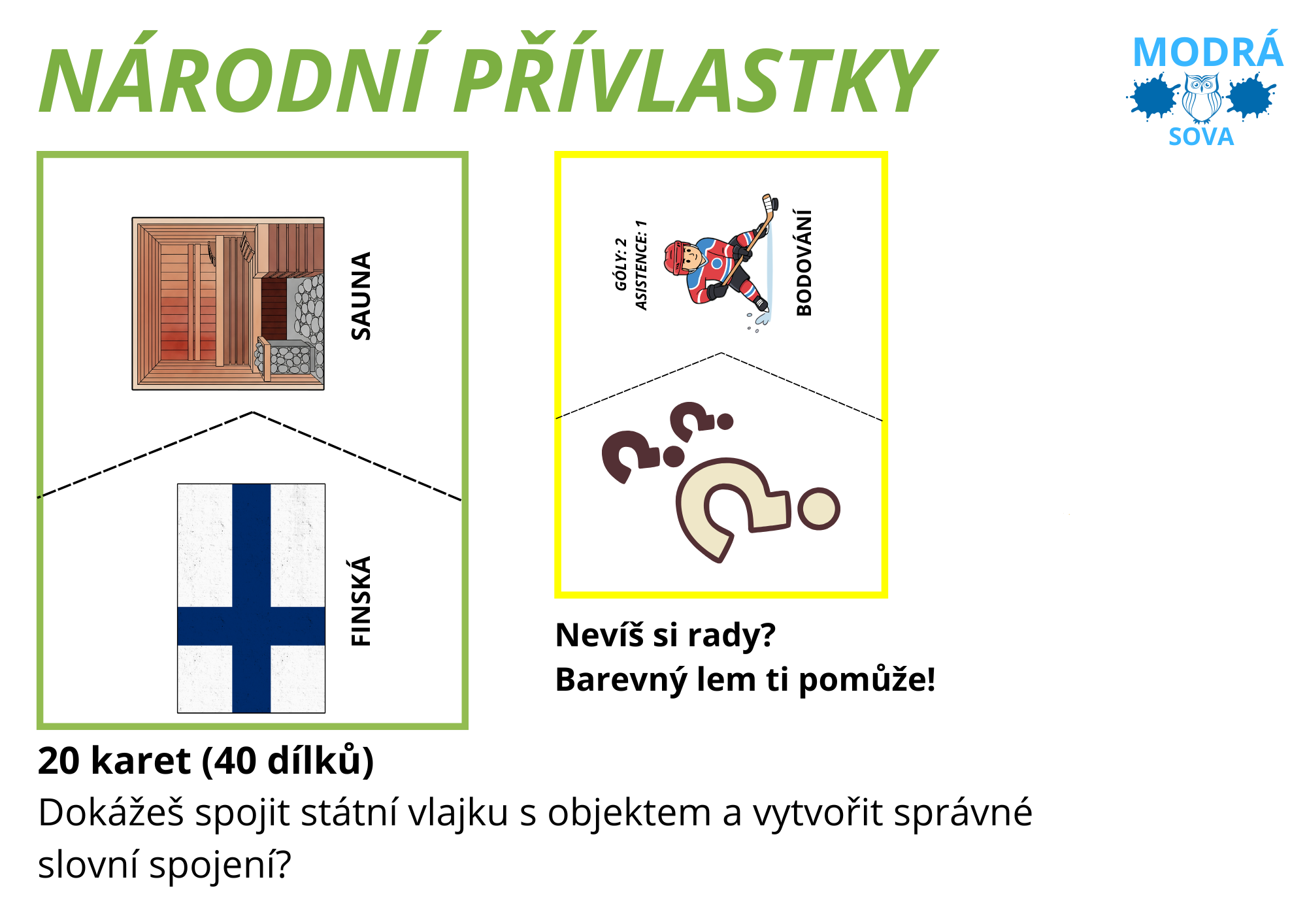 Tato puzzle hra seznamuje děti s národními přívlastky prostřednictvím známých předmětů, jídel a pojmů. Každou dvojici tvoří vlajka státu a objekt, se kterým se daný národní přívlastek běžně spojuje. Děti si tak nenápadně osvojují nejen slovní zásobu, ale také základní přehled o státech a jejich symbolech.