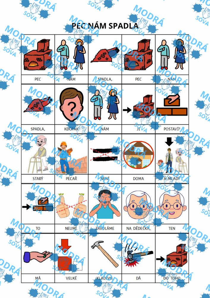 Tradiční česká lidová písnička „Pec nám spadla“ vypráví humorný příběh o spadlé peci a její opravě a dětem přibližuje každodenní starosti našich předků. Píseň je zpracována formou piktogramů do podoby obrázkové písničky, která usnadňuje porozumění textu. Stejně jako další piktogramové materiály podporuje rozvoj komunikace u dětí s PAS, vývojovou dysfázií a u neverbálních dětí. Materiál je vhodný pro školy, školky i domácí použití.