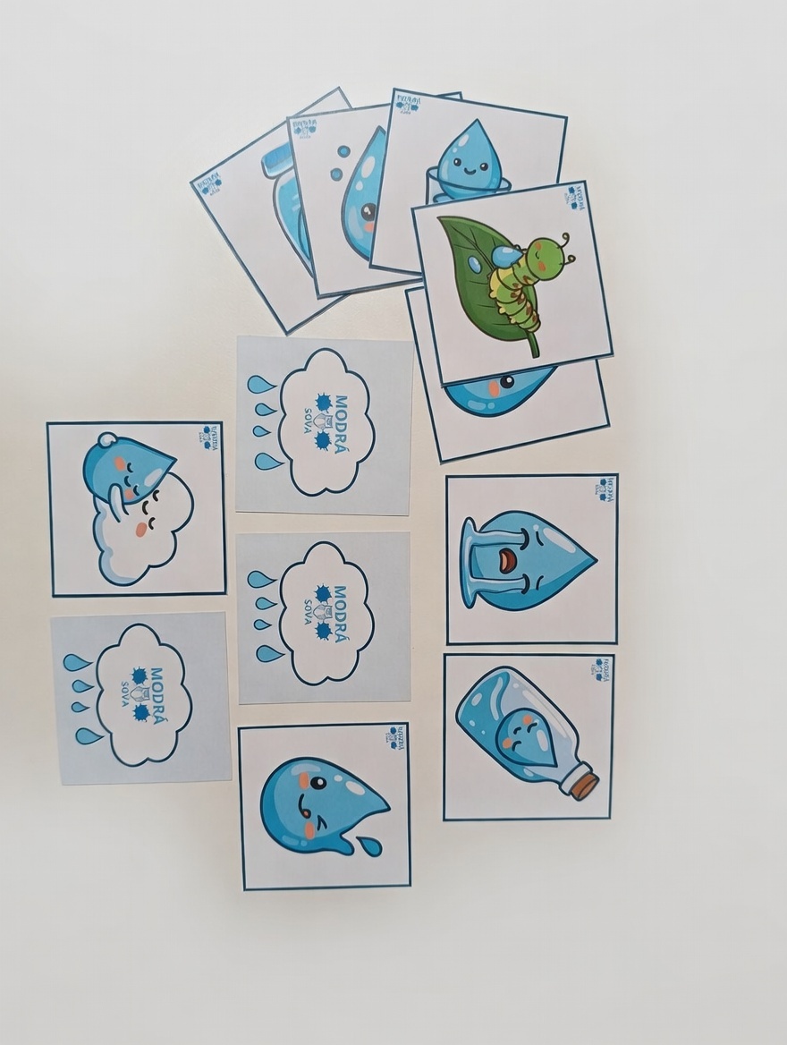 Soubor obsahuje pexeso s 12 páry karet, na kterých děti najdou různé symboly spojené s vodou – například motivy koloběhu vody v přírodě, kapky vody nebo obrázky znázorňující emoce, které voda může symbolicky představovat (radost, smutek). Při hře si děti procvičují paměť, soustředění i schopnost pojmenovávat jednotlivé obrázky.