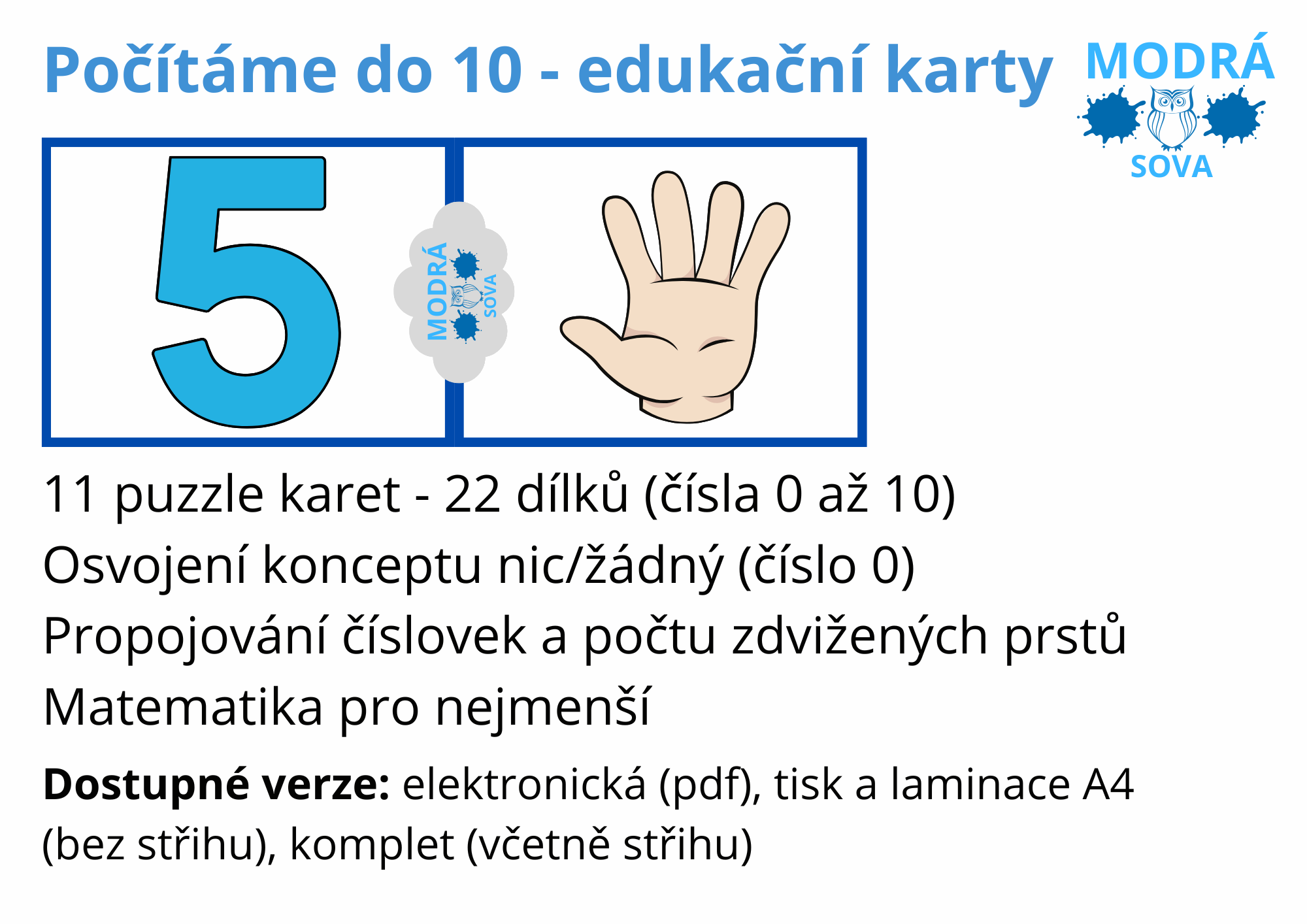 Tato edukační sada obsahuje 11 párů puzzle karet, které propojují číslovku a ruku se správným počtem zdvižených prstů. Dítě si tak jednoduše spojí symbol čísla s konkrétním množstvím a zároveň se přirozeně setká i s konceptem „nic/žádný“ (číslo 0).