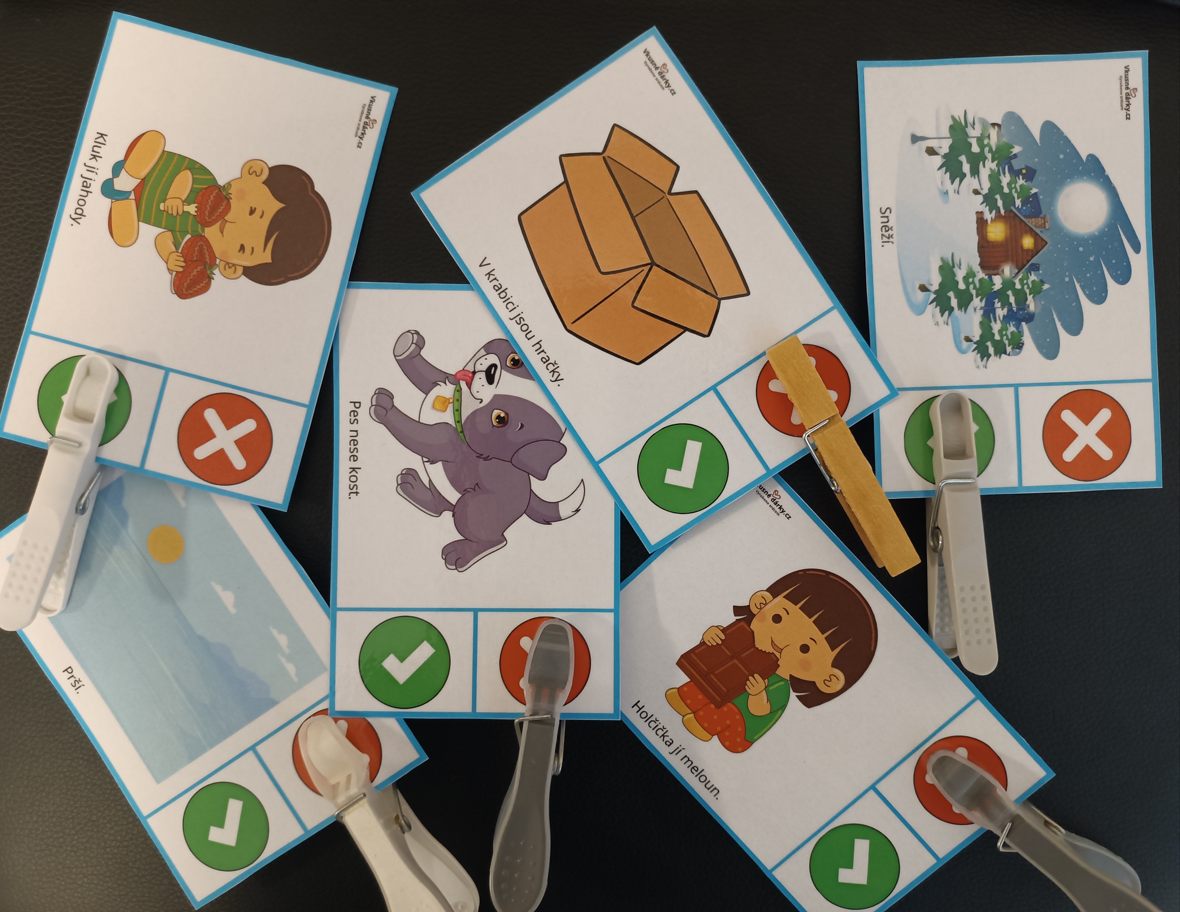 Rodič/dítě vybere kartu a položí ji viditelně před sebe. Rodič přečte zřetelně text. Dítě se rozhoduje, jestli je tvrzení správné, může na obrázku ukázat chybu a zkusit ji slovy popsat/opravit. Následně kolíčkem označí symbol pravdy/nepravdy.