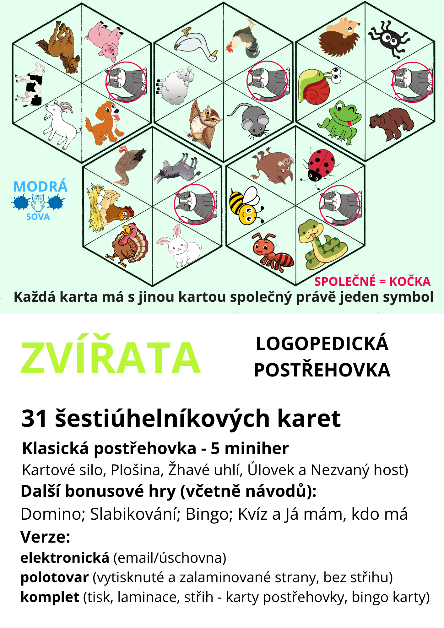 Verze komplet - produkt obsahuje vytisknutých a zalaminovaných 9 stran A4, 31 stran A6 a hotové bingo karty a karty postřehovky (původně 9 A4 stran).