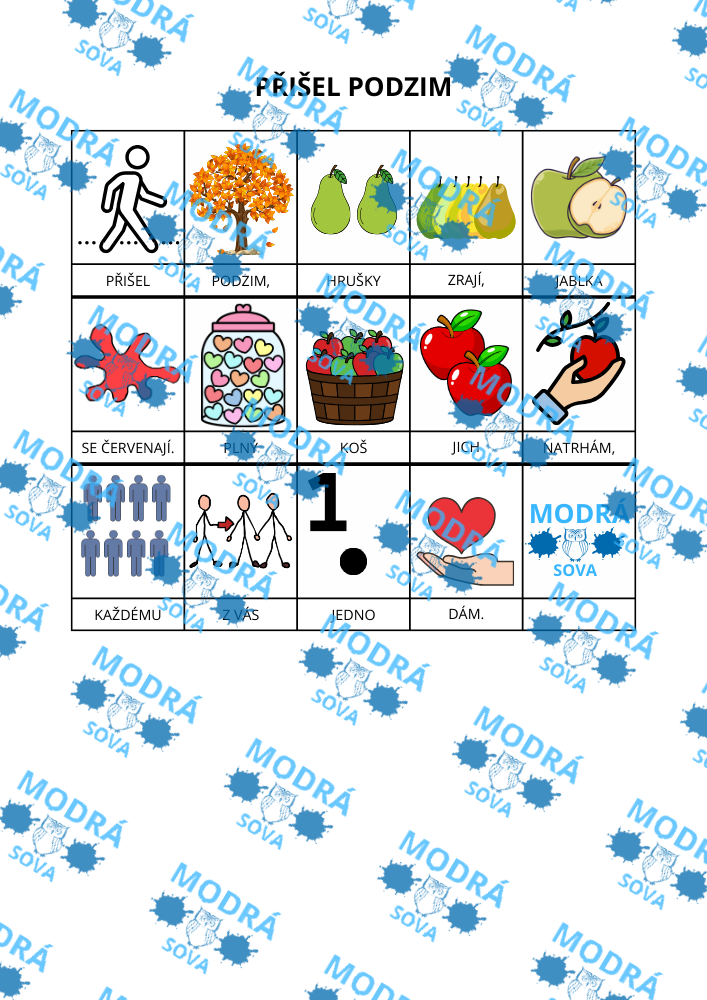 Básnička Přišel podzim je vhodným výukovým materiálem pro všechny malé koledníky. Díky hravým piktogramům nenásilně pomáhá rozvíjet porozumění u všech dětí a je vhodná i pro děti s narušenou komunikační schopností (např. pro děti s PAS, vývojovou dysfázií apod.).