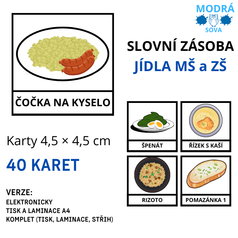 - Rozšířená slovní zásoba Jídla MŠ a ZŠ (40 kartiček), kartičky 4,5 x 4,5 cm