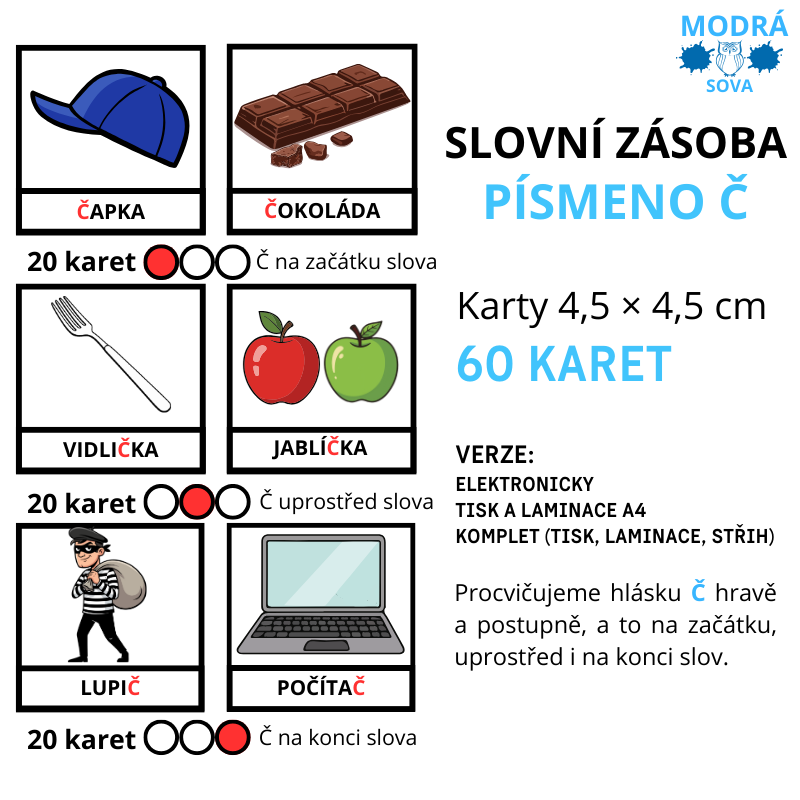 Hláska Č patří mezi sykavky (podobně jako c, s, š, z, ž), které jsou pro děti náročnější na výslovnost. Vyžaduje přesnou spolupráci jazyka, rtů i správný proud vzduchu. Aby se její výslovnost opravdu upevnila, je důležité procvičovat ji v různých pozicích ve slově – nejen na jednom typu slov.