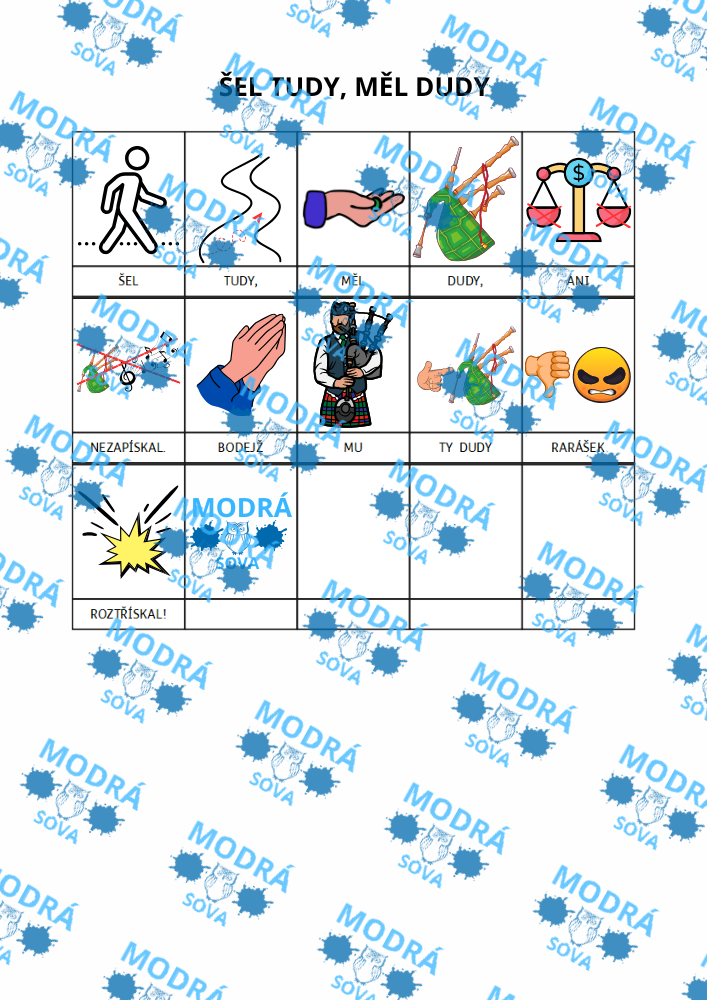 Písnička Šel tudy, měl dudy je vhodným výukovým materiálem pro všechny malé zpěváky. Díky hravým piktogramům nenásilně pomáhá rozvíjet porozumění u všech dětí a je vhodná i pro děti s narušenou komunikační schopností (např. pro děti s PAS, vývojovou dysfázií apod.).