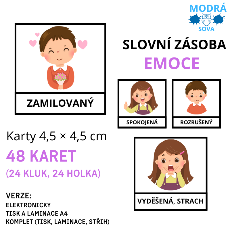3. Základní slovní zásoba EMOCE (48 kartiček), kartičky 4,5 x 4,5 cm