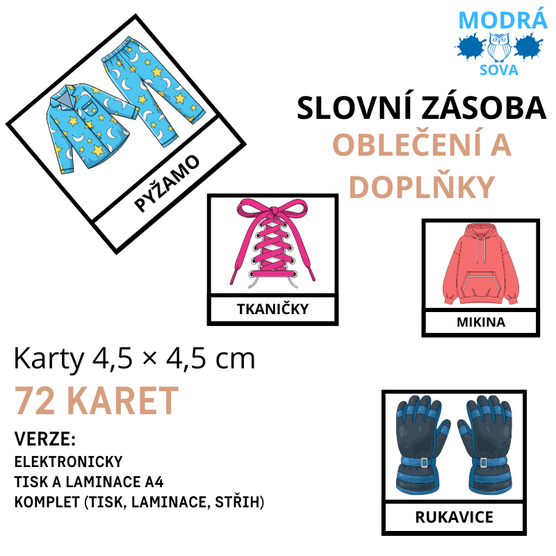 - Základní slovní zásoba OBLEČENÍ a DOPLŇKY (72 kartiček), kartičky 4,5 x 4,5 cm
