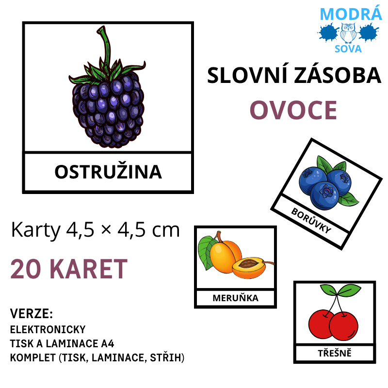 3. Základní slovní zásoba OVOCE (20 kartiček), kartičky 4,5 x 4,5 cm