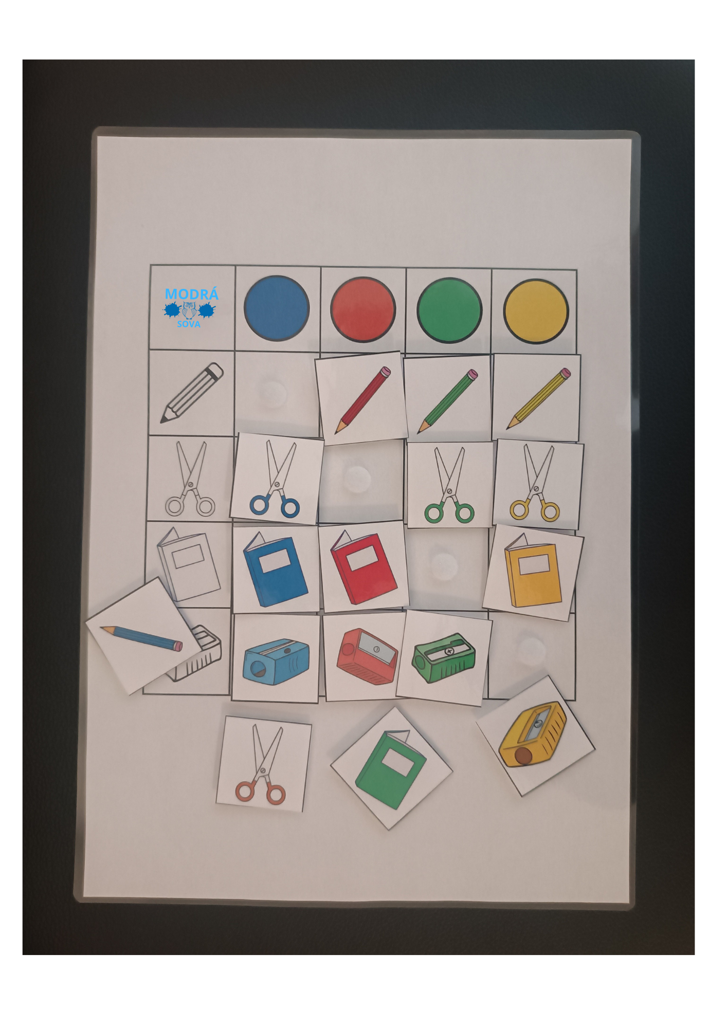 Obsah: 3 vytisknuté a zalaminované A4 stránky s třídicími tabulkami s aplikovanými suchými zipy (plyš) a 48 vytisknutých, zalaminovaných a nastříhaných karet s aplikovanými suchými zipy (háček), připraveno k okamžitému použití