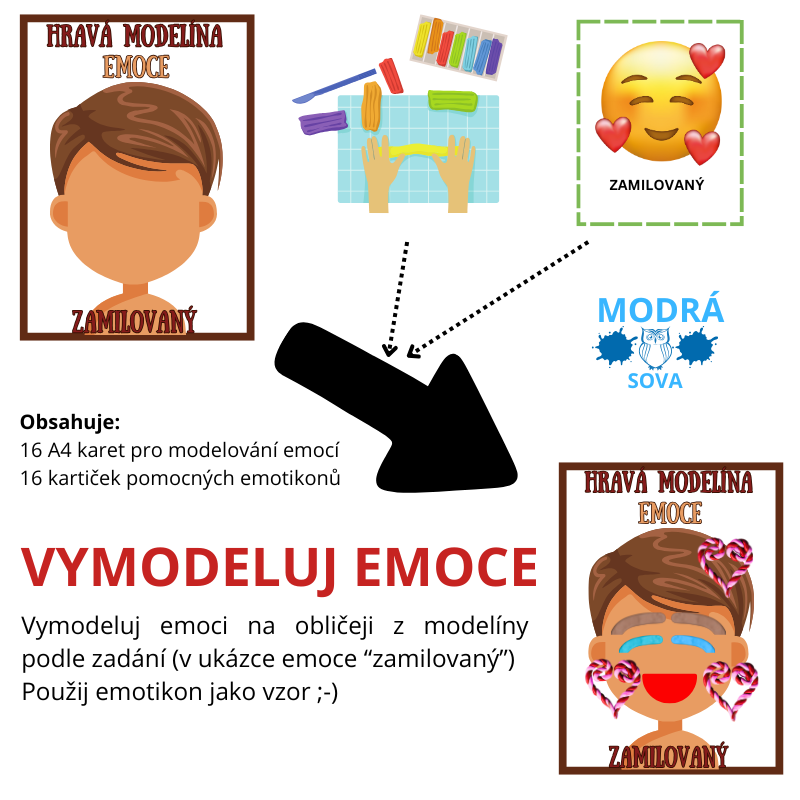 Objevte originální způsob, jak u dětí rozvíjet emocionální inteligenci a jemnou motoriku! Aktivita Vymodeluj emoce obsahuje 16 velkých laminovaných předloh s obličeji chlapce a dívky, které děti dotvářejí pomocí modelíny nebo plastelíny. Na každé kartě najdete zadání konkrétní emoce – například smutek, únavu, nervozitu nebo šok. Aby úkol nebyl pro děti příliš náročný, součástí sady jsou i menší kartičky s emotikony, které dětem pomohou lépe si výraz představit.