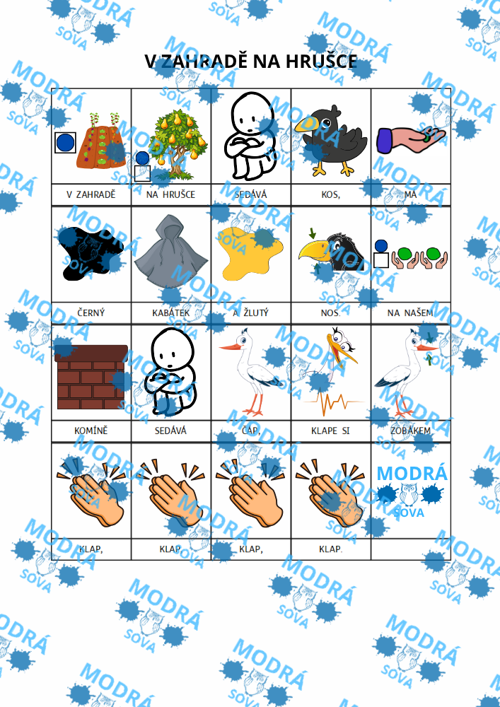 Písnička V zahradě na hrušce je vhodným výukovým materiálem pro všechny malé zpěváky. Díky hravým piktogramům nenásilně pomáhá rozvíjet porozumění u všech dětí a je vhodná i pro děti s narušenou komunikační schopností (např. pro děti s PAS, vývojovou dysfázií apod.).