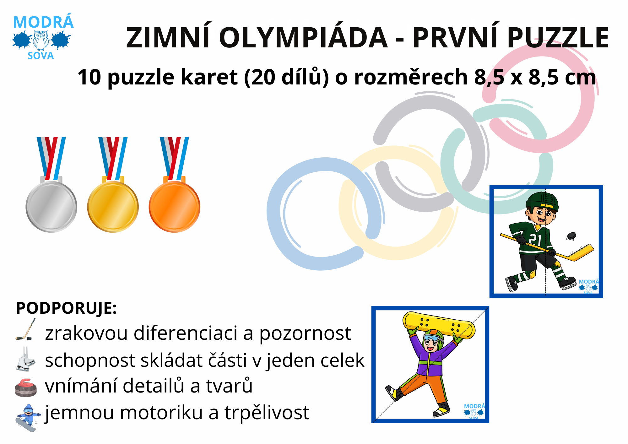 Originální puzzle s motivy zimních sportů ze zimní olympiády, navržené pro nejmenší děti. Každý čtvercový obrázek (8,5 × 8,5 cm) je rozdělený svislou, vodorovnou nebo diagonální čárou na dvě poloviny. Úkolem dítěte je spojit správné dvojice tak, aby vznikl celý obrázek se sportovní disciplínou – například lyžováním, hokejem, krasobruslením nebo curlingem.